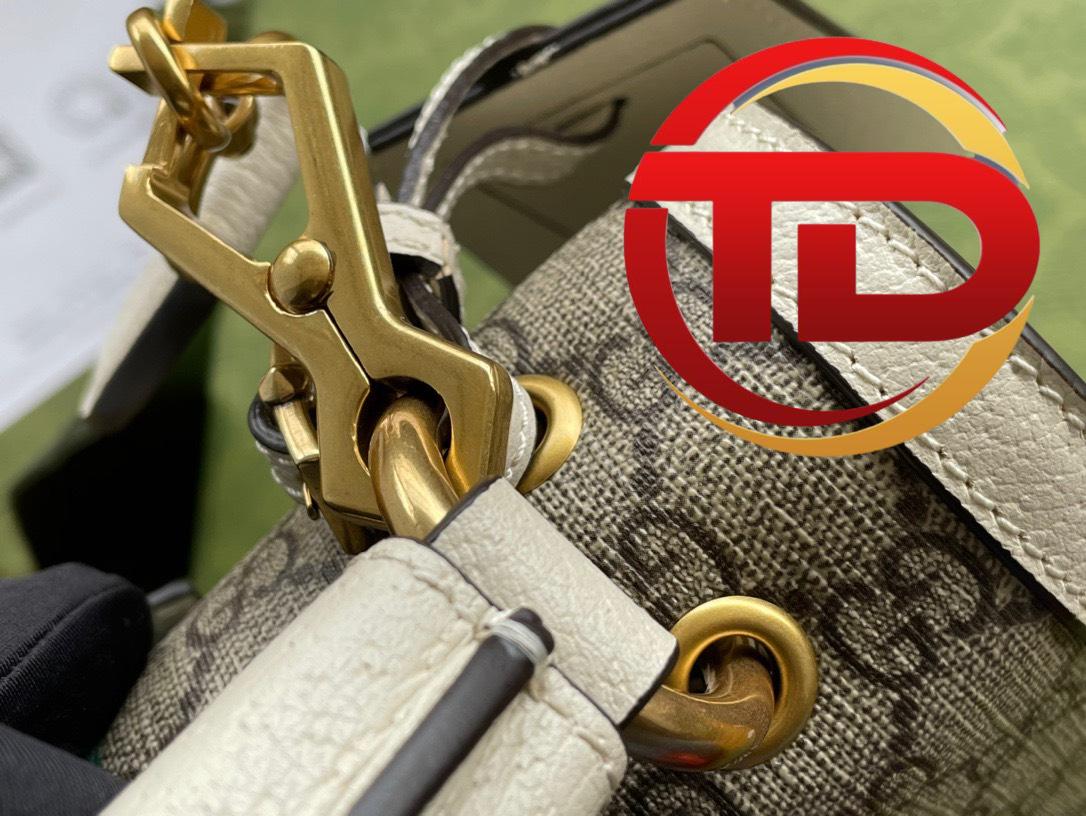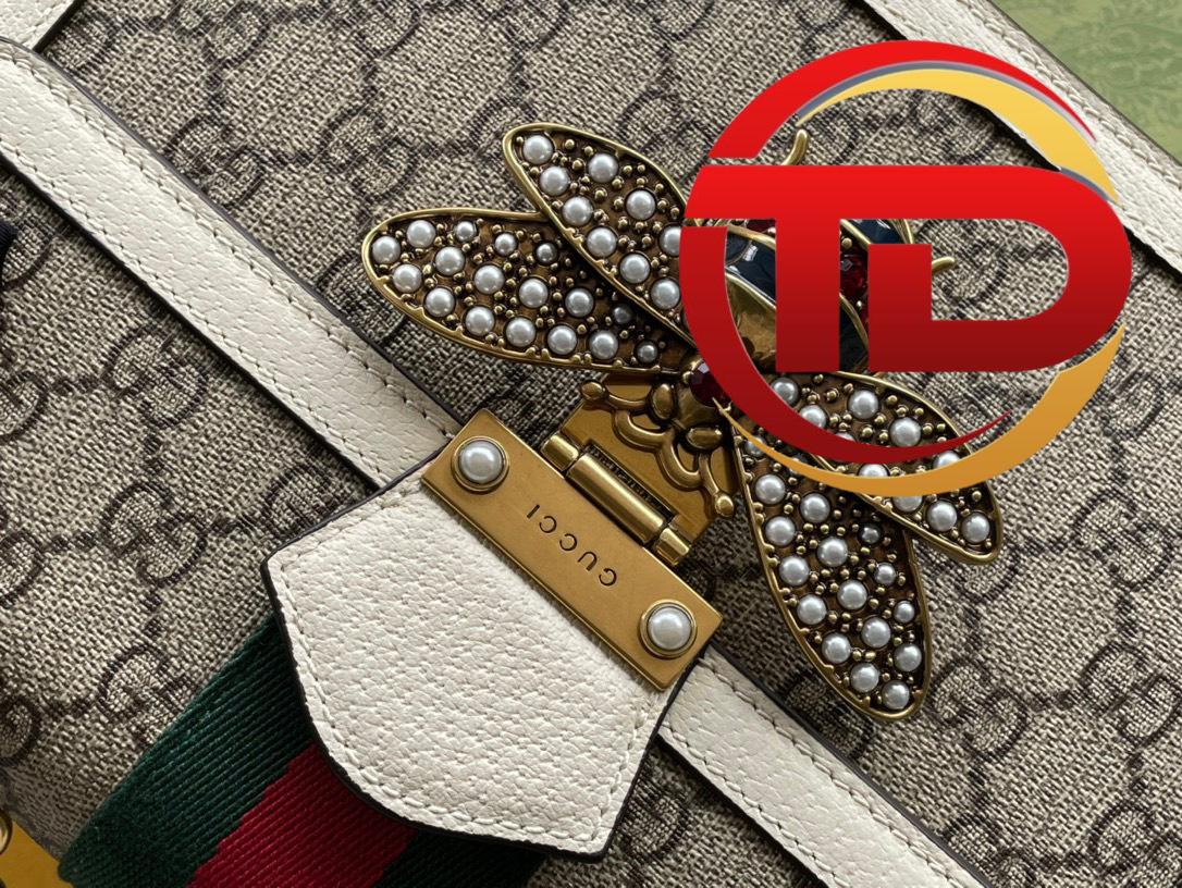 Nếu là “tín đồ” lâu năm của Gucci, bạn sẽ nhận ra ngay chất liệu canvas hoạ tiết GG được hãng khai thác từ thời Thế Chiến II. Phần khoá cài trang trí hình con ong được đính kết đá tinh xảo. Trong văn hoá châu Âu, loài ong là biểu tượng của giới quý tộc thượng lưu. Ribbon kẻ sọc xanh navy- đỏ trên quai đeo (trap) và thân túi cũng là một trong những chi tiết đặc trưng của Gucci.
