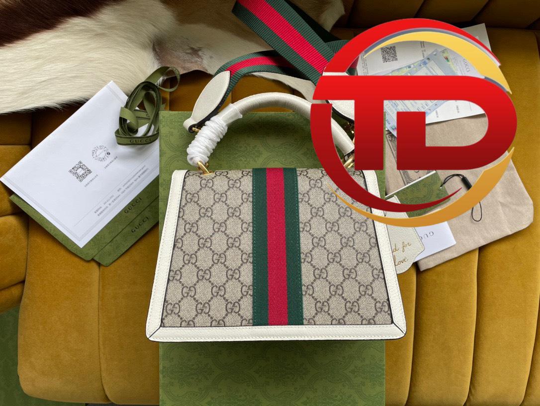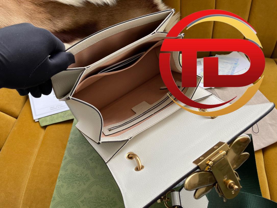 Phần quai xách (top handle) đính dập chữ ‘Blind for Love’, cùng với viền túi được làm từ da cao cấp, nhuộm đỏ vô cùng nổi bật và quyến rũ. Nội thất gồm 3 ngăn: 2 ngăn phụ, 1 ngăn chính, lót da lộn. Túi Gucci Queen Margaret có nét cổ điển, cầu kỳ và vương giả ít thấy các mẫu túi hiện đại của hãng.