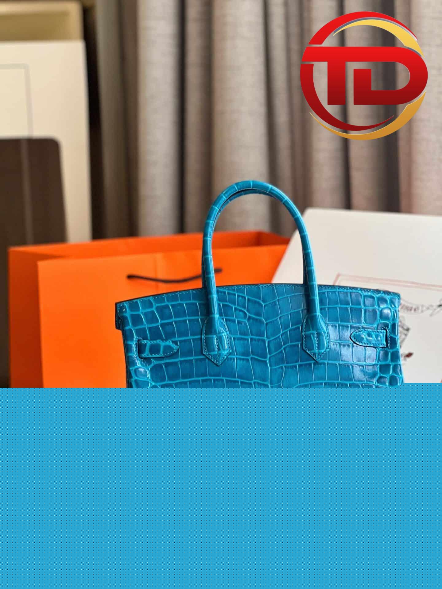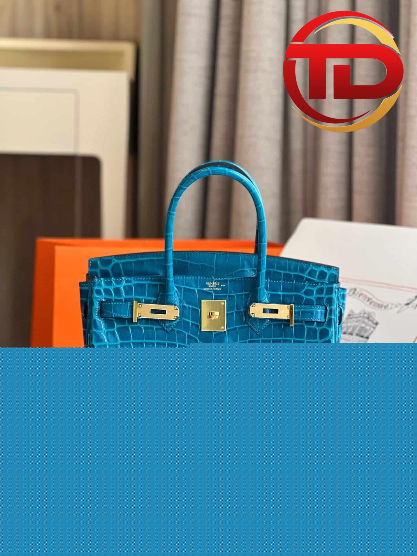 Khóa túi được thiết kế từ kim loại mạ vàng cao cấp nổi bật trên gam màu xanh dương mát mẻ đi cùng ổ khóa được bọc lớp da cùng màu. Phần tay cầm bằng da cùng tone màu và chất liệu giúp tạo nên nét đồng điệu cũng như góp phần rất lớn trong việc định hình phong cách cho các nàng thơ của chúng ta.