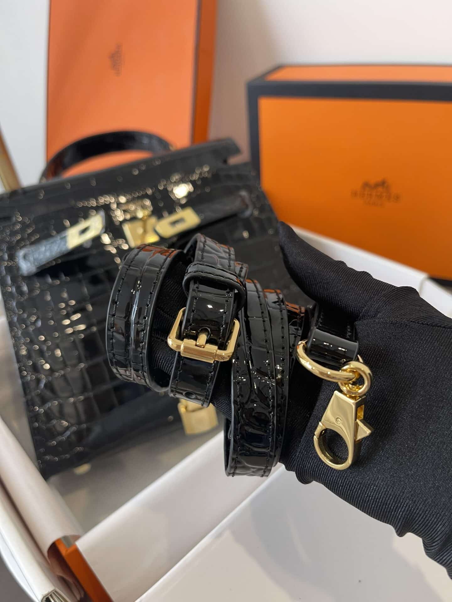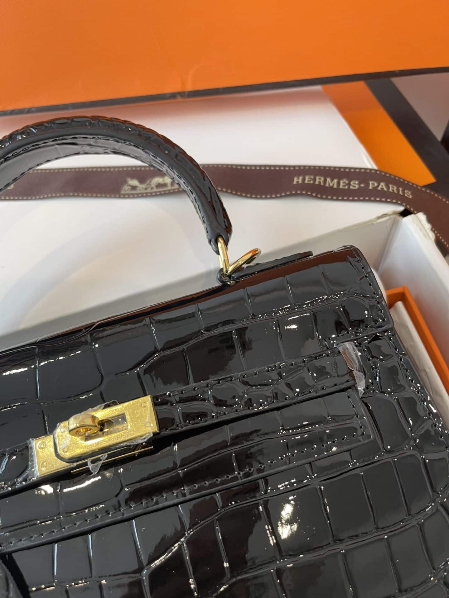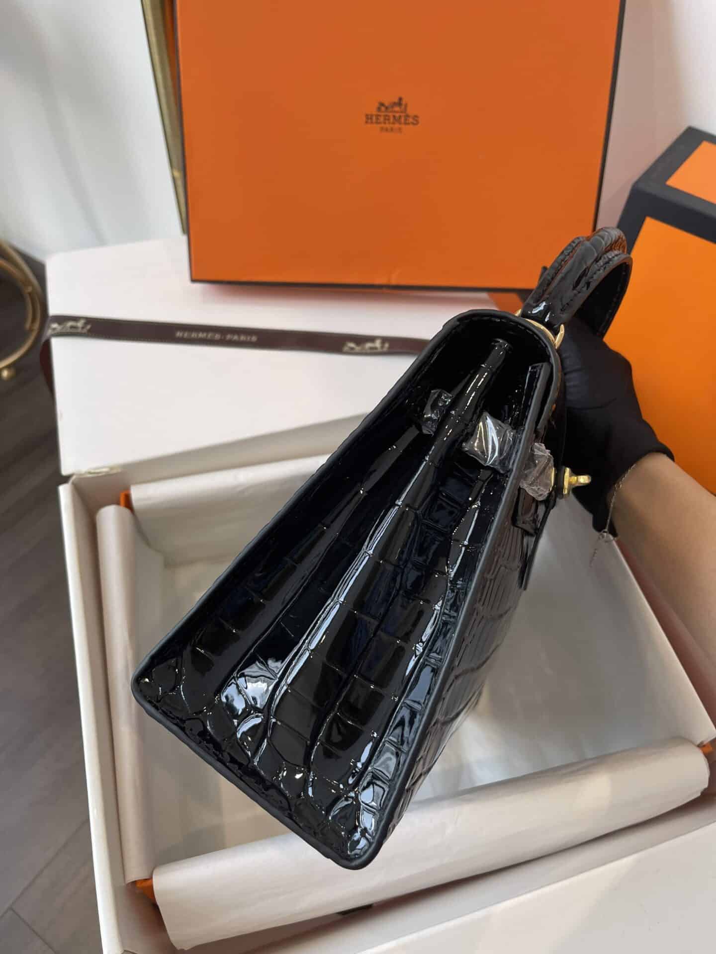 TÚI HM KELLY NGUYÊN BẢN TAG VÀNG VÂN CÁ SẤU DA BÓNG TỰ NHIÊN MÀU ĐEN