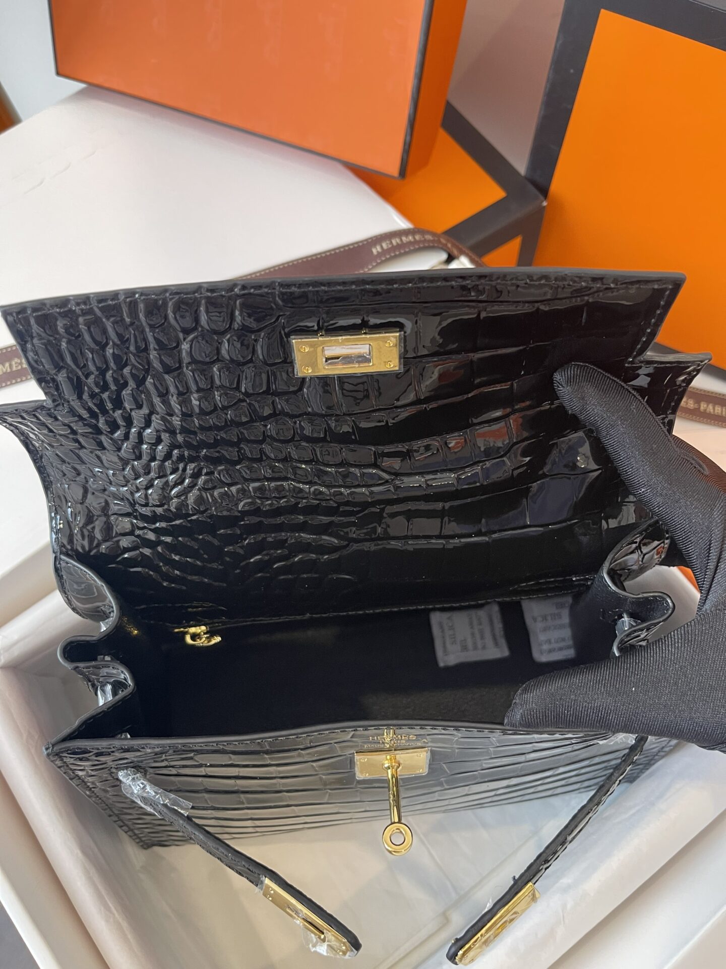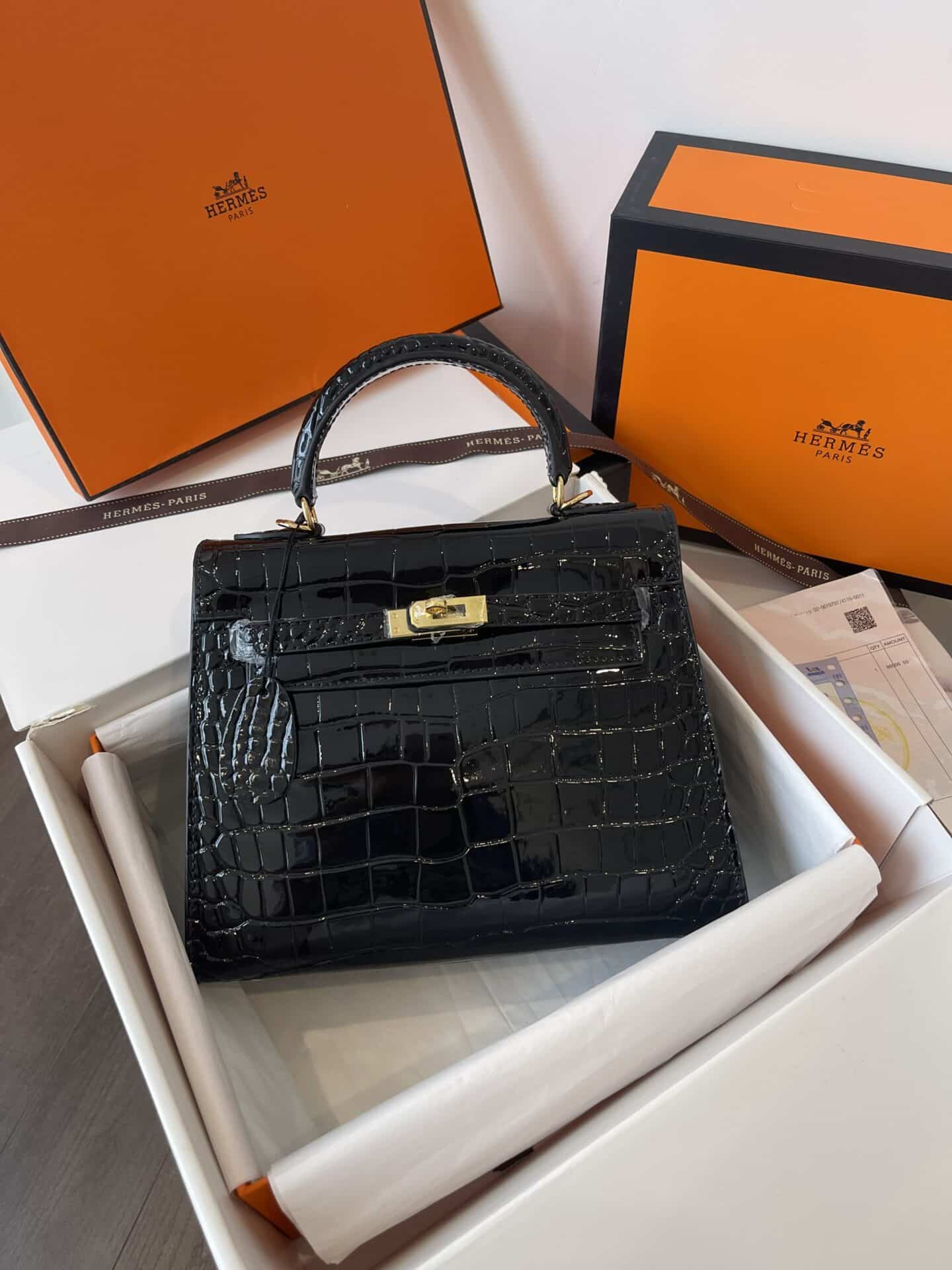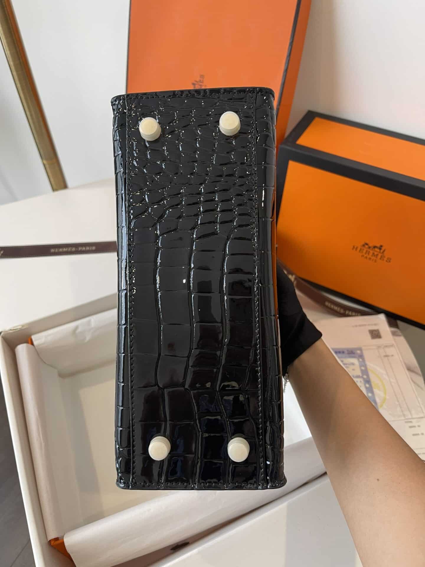TÚI HM KELLY NGUYÊN BẢN TAG VÀNG VÂN CÁ SẤU DA BÓNG TỰ NHIÊN MÀU ĐEN