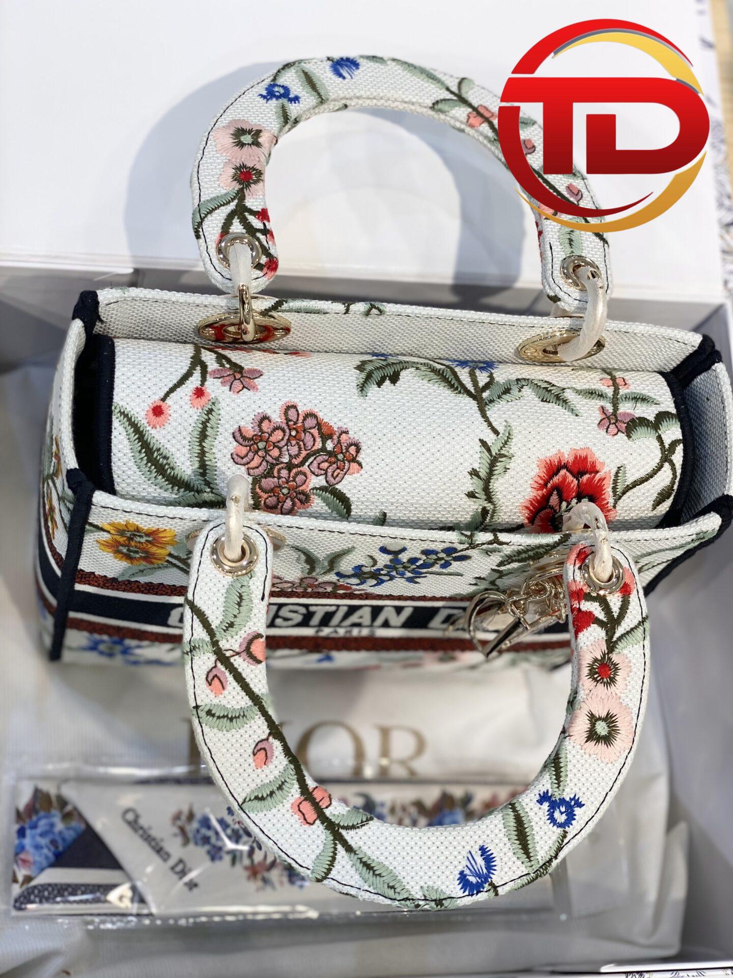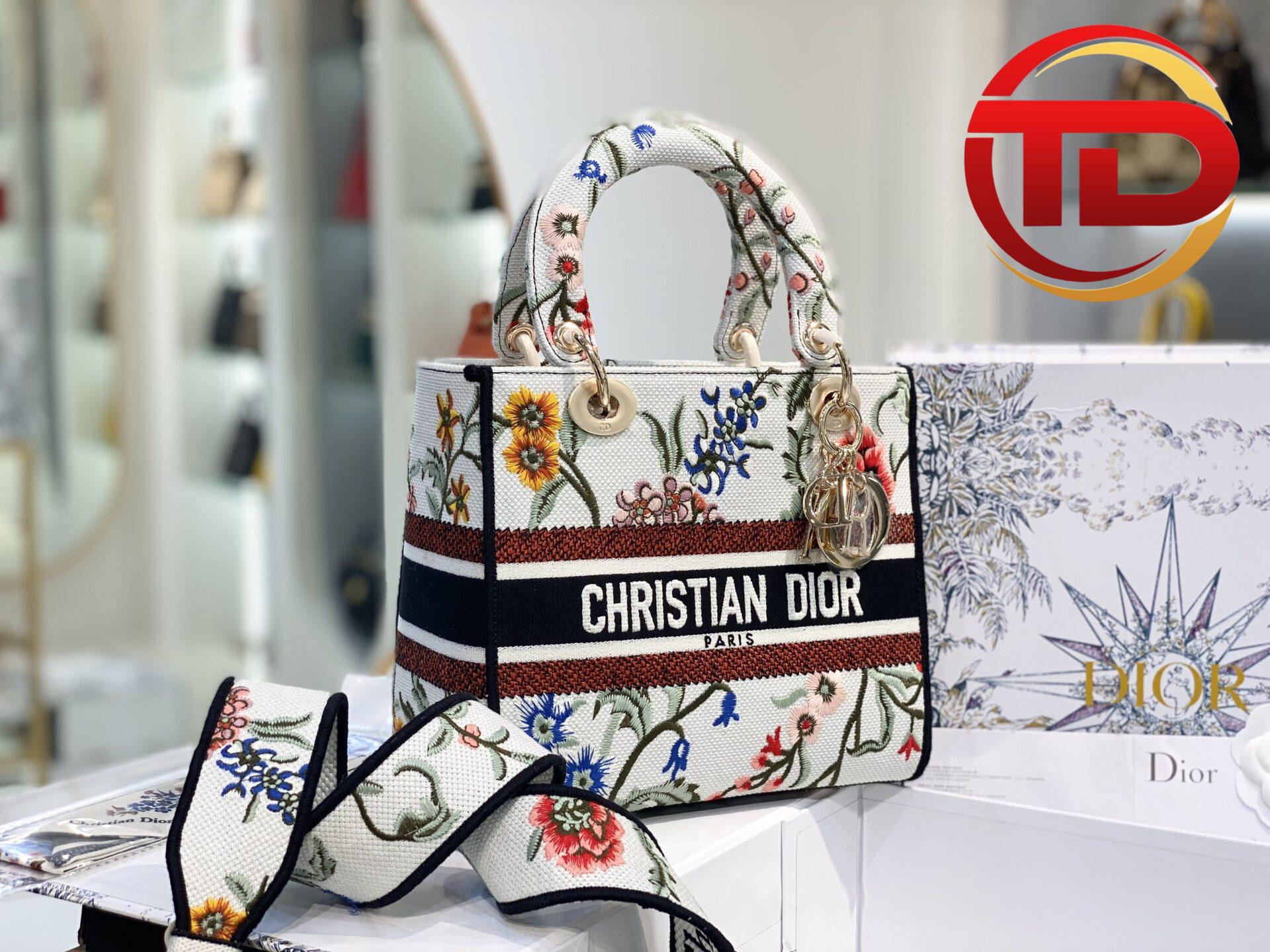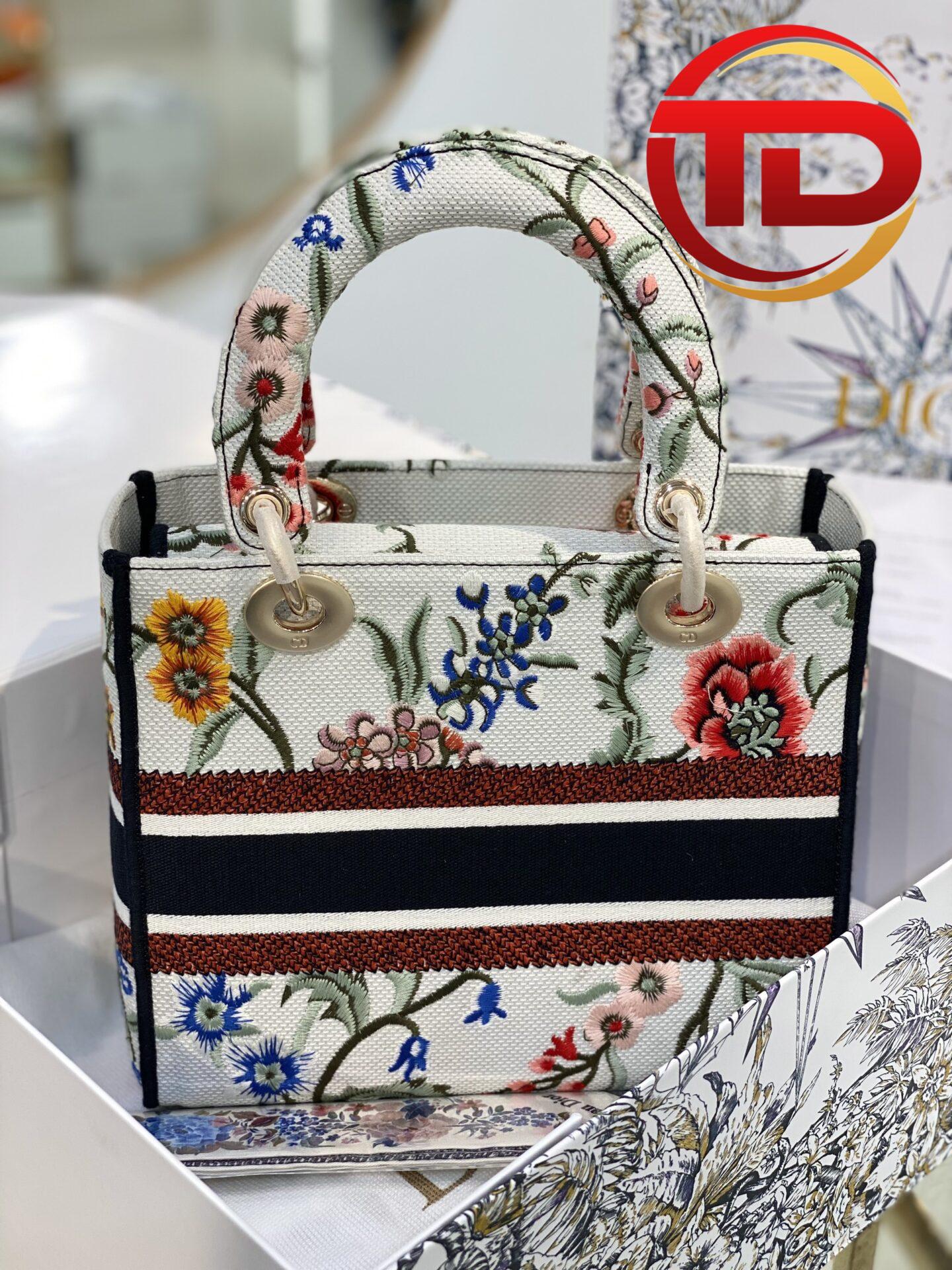 TÚI LADY DIOR MEDIUM SIZE D-LITE BAG WHITE MULTICOLOR PETITES FLEURS EMBROIDERY