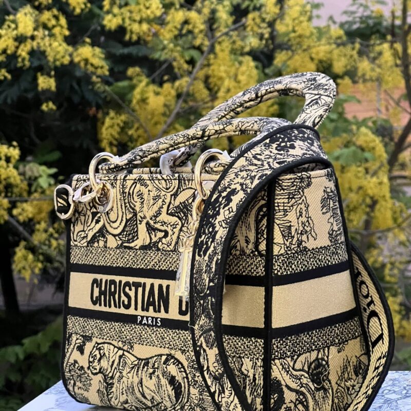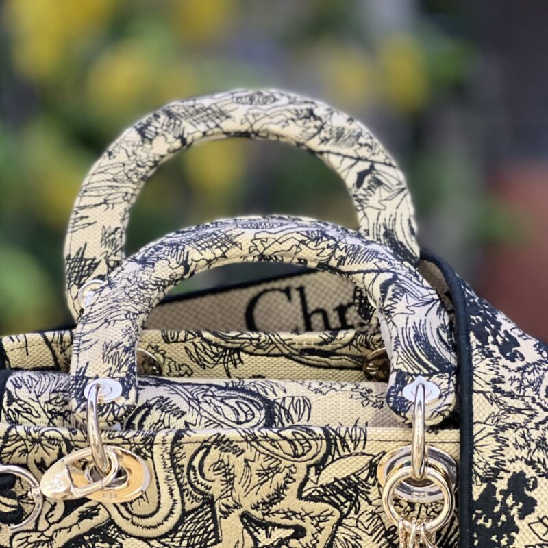 TÚI LADY DIOR NGUYÊN BẢN MEDIUM SIZE D-LITE BAG BROWN TOILE DE JOUY EMBROIDERY