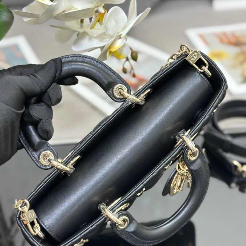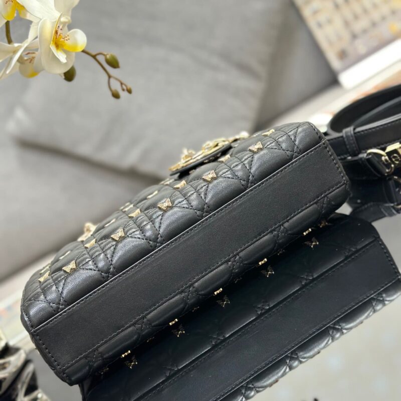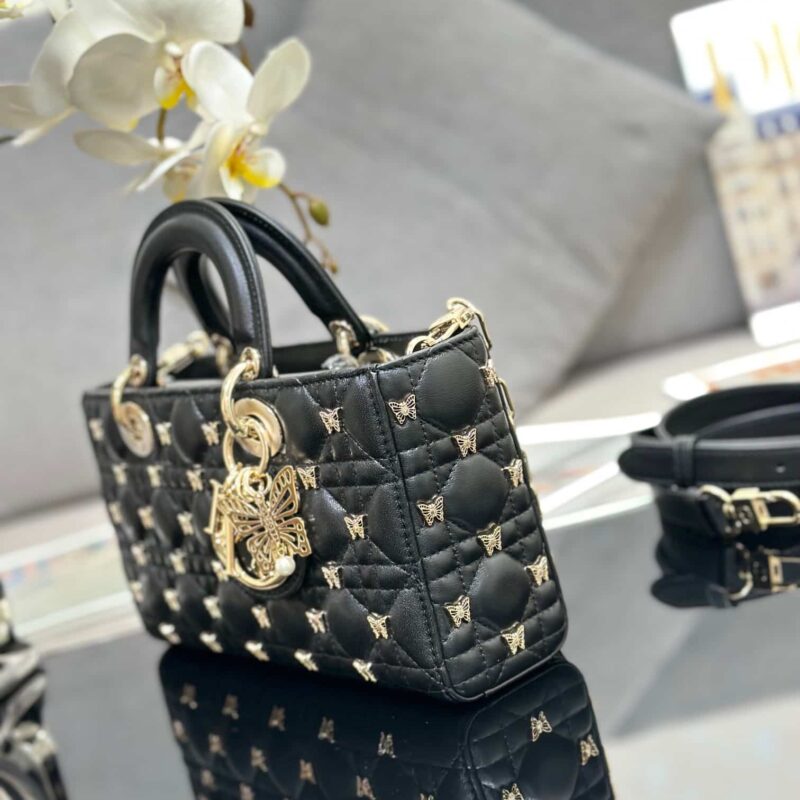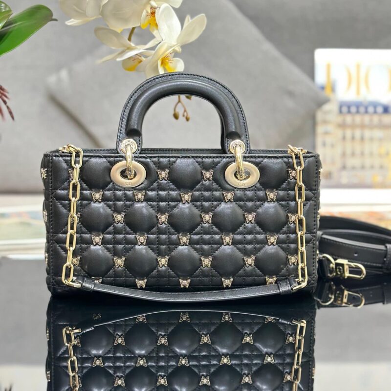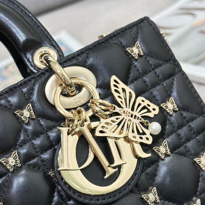TÚI MEDIUM LADY D-JOY BAG BLACK CANNAGE LAMBSKIN WITH GOLD-FINISH BUTTERFLY STUDS SIÊU CẤP
