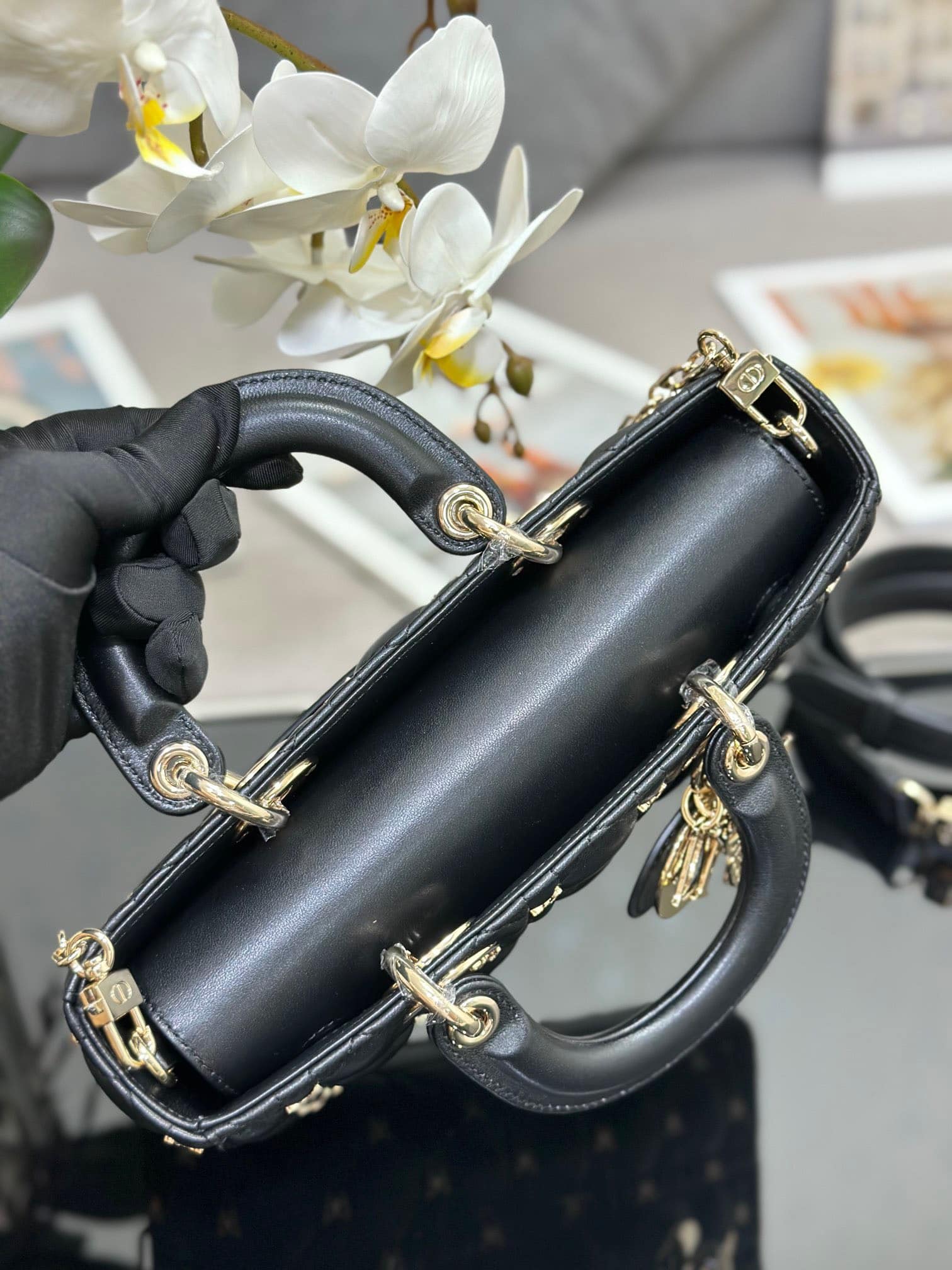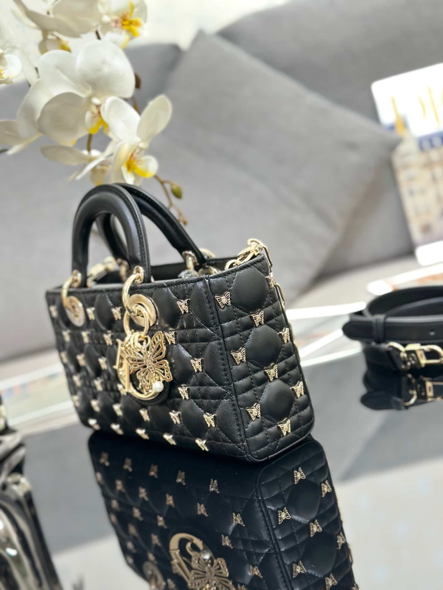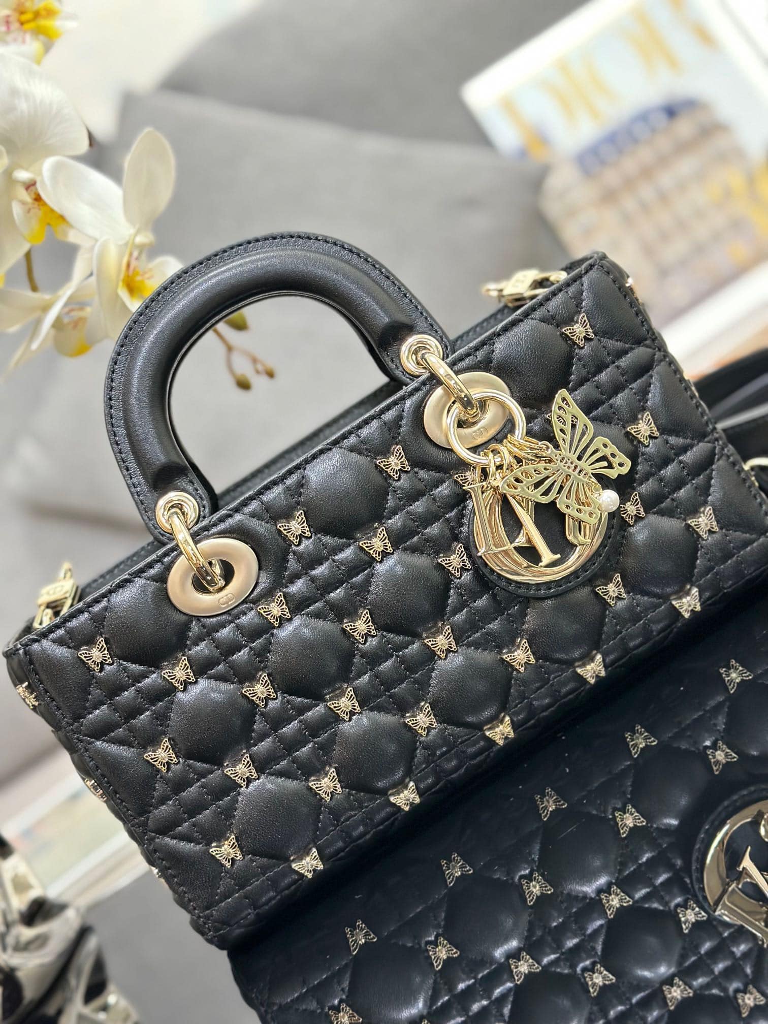 TÚI MEDIUM LADY D-JOY BAG BLACK CANNAGE LAMBSKIN WITH GOLD-FINISH BUTTERFLY STUDS SIÊU CẤP