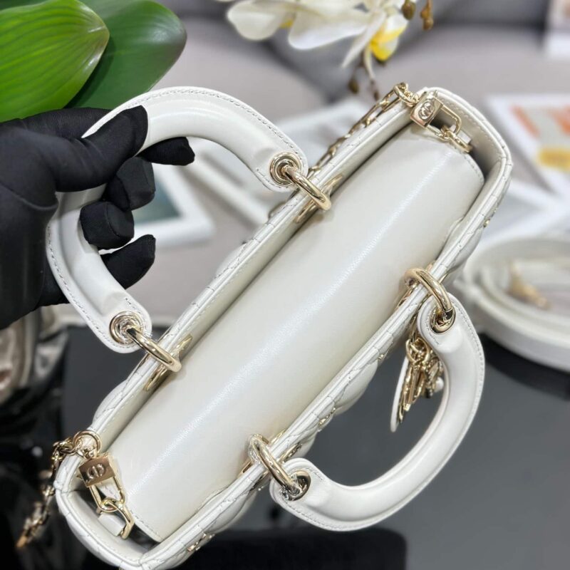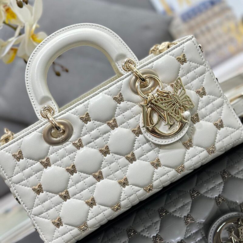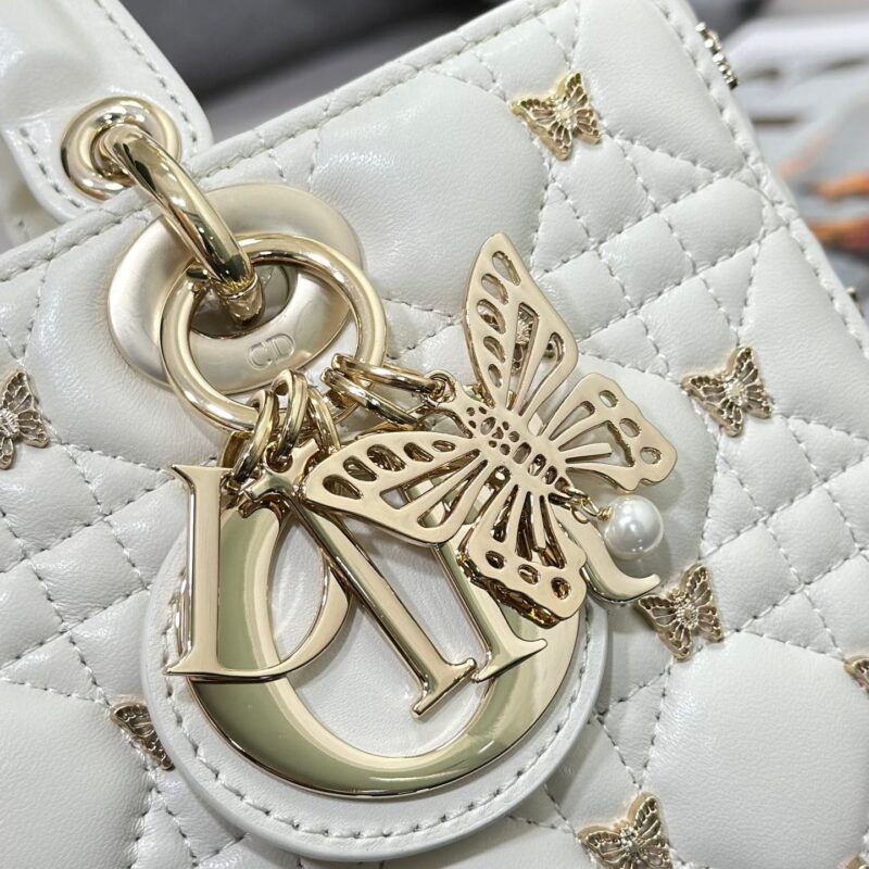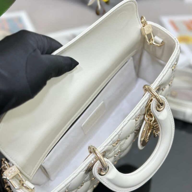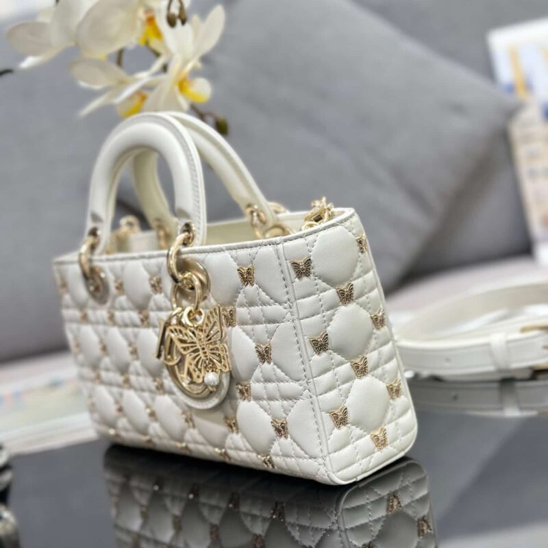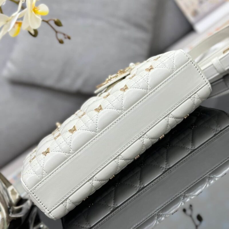 TÚI MEDIUM LADY D-JOY BAG WHITE CANNAGE LAMBSKIN WITH GOLD-FINISH BUTTERFLY STUDS SIÊU CẤP