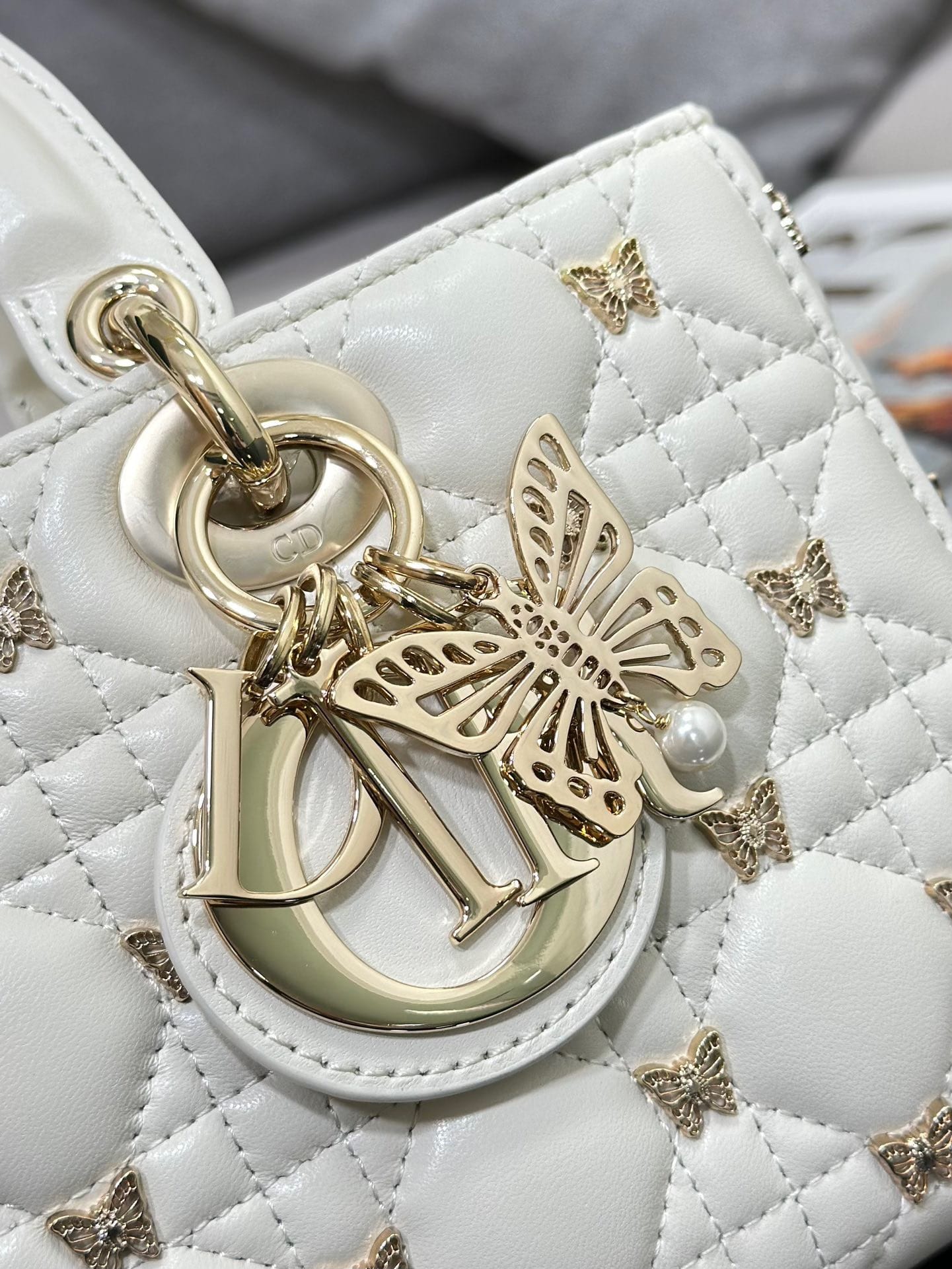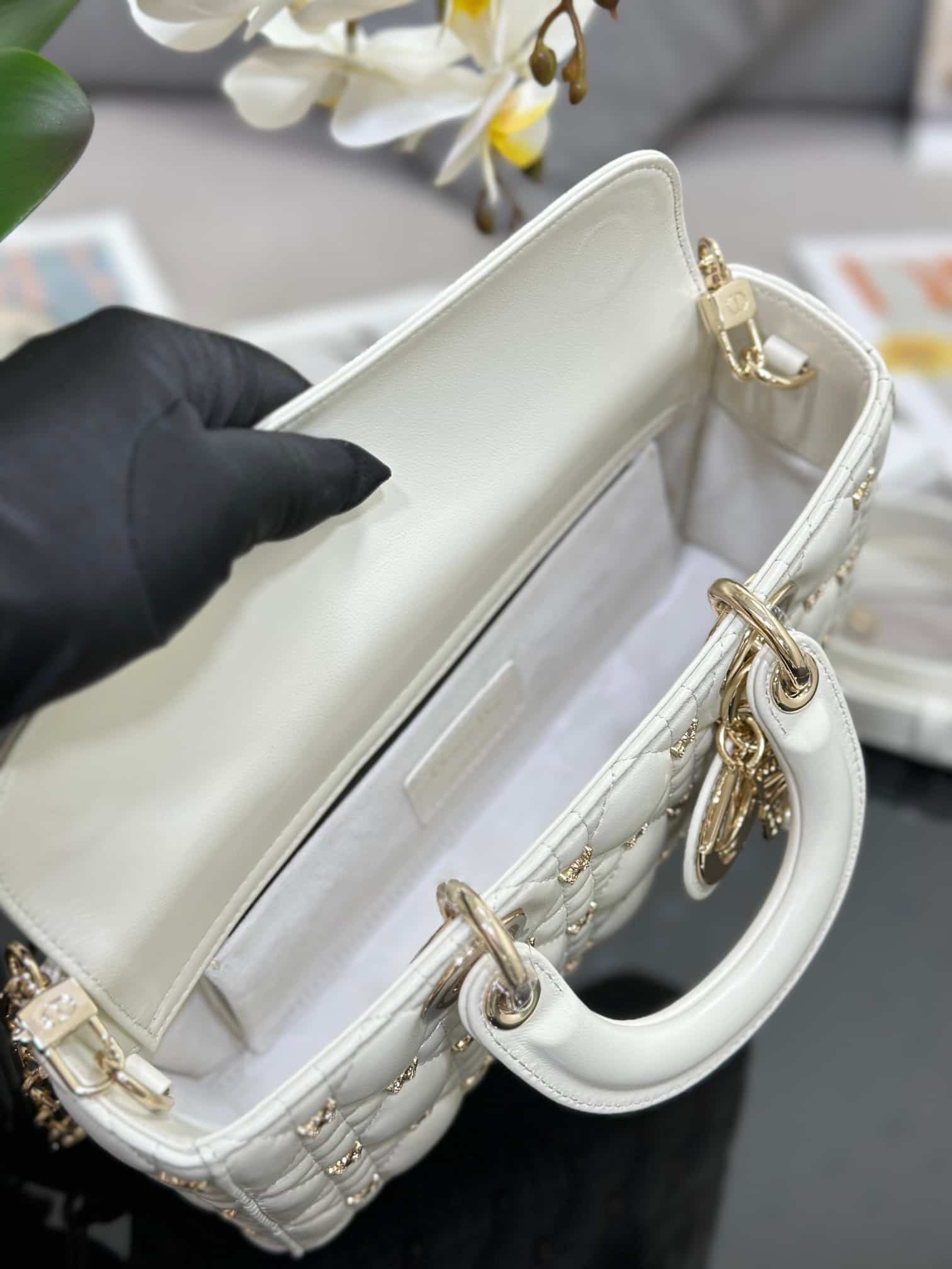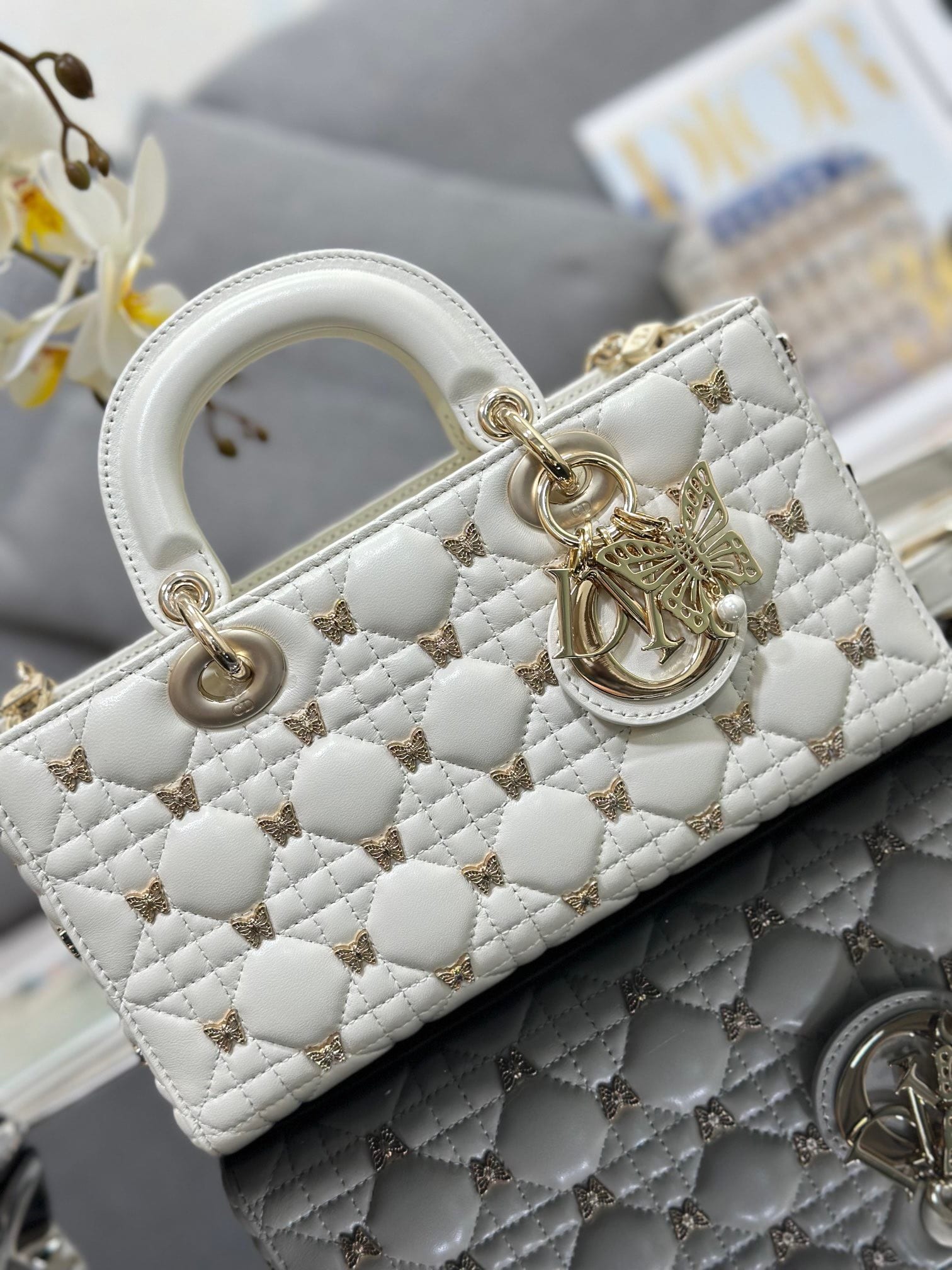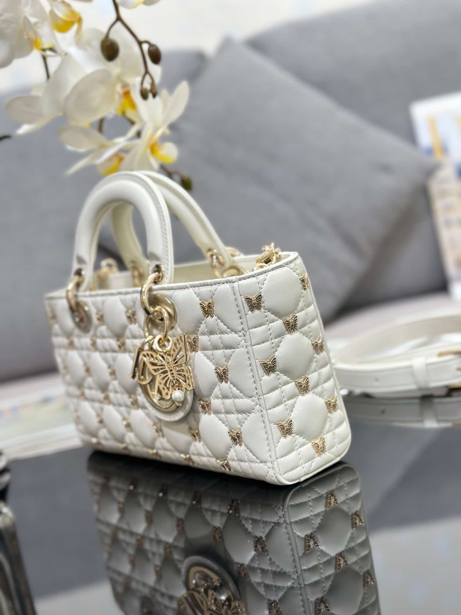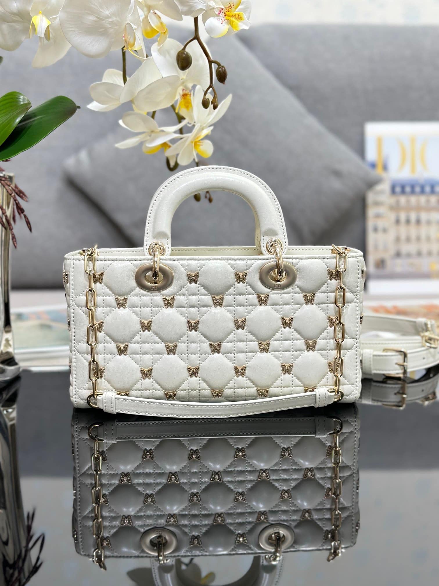 TÚI MEDIUM LADY D-JOY BAG WHITE CANNAGE LAMBSKIN WITH GOLD-FINISH BUTTERFLY STUDS SIÊU CẤP