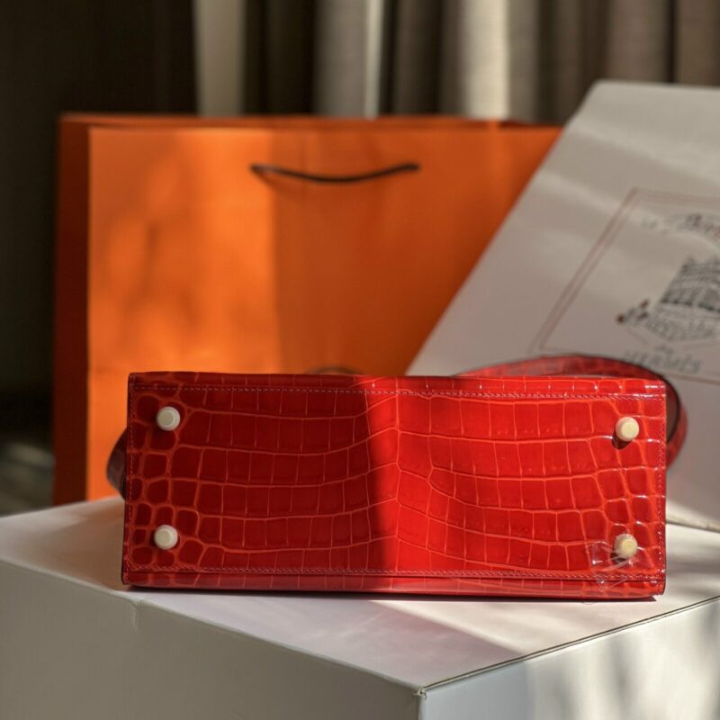 Chiếc khóa Kelly quen thuộc và kinh điển bằng kim loại cao cấp đã tạo điểm nhấn đặc biệt cho tổng thể thiết kế. Phần nắp gập của túi được cố định bằng dây da cá sấu đồng điệu, trang bị thêm khóa xoay chắc chắn giúp bảo vệ đồ dùng bên trong an toàn và tạo điểm nhấn cuốn hút tại vị trí trung tâm sản phẩm. Đáy túi có 4 chiếc tinh tán các góc giúp bảo về túi đứng vững trên mọi bề mặt.