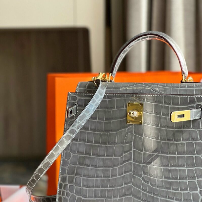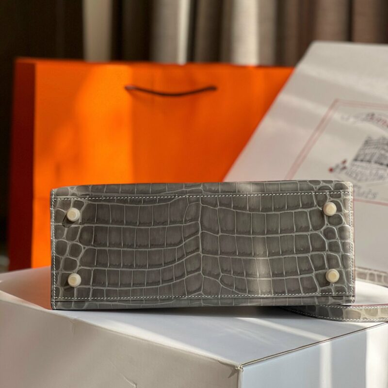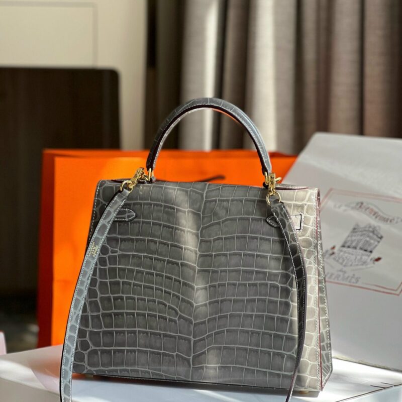 TÚI XÁCH HM HERMES KELLY 28 CROCODILE SIÊU CẤP KHÂU TAY 100% MÀU GHI