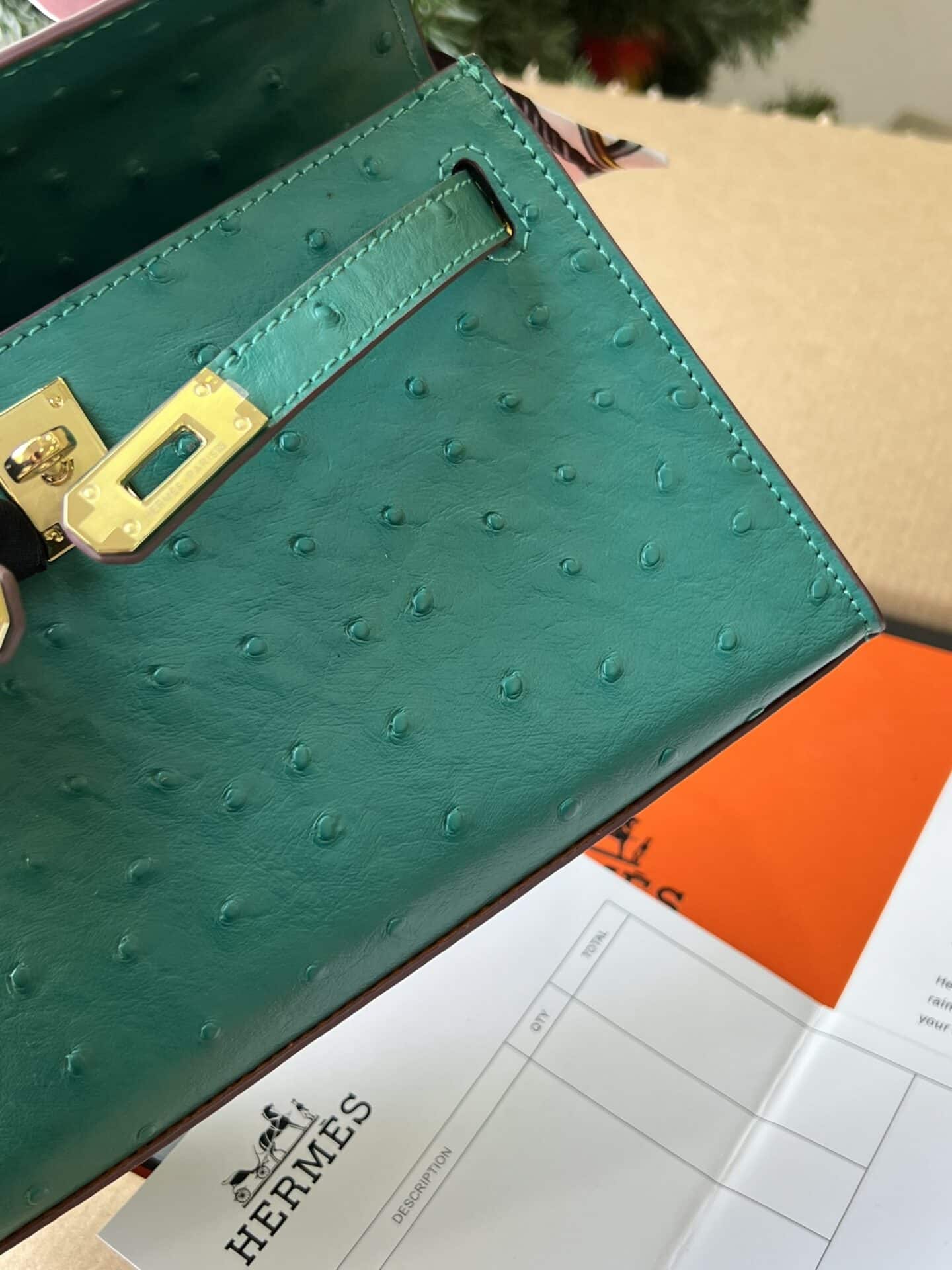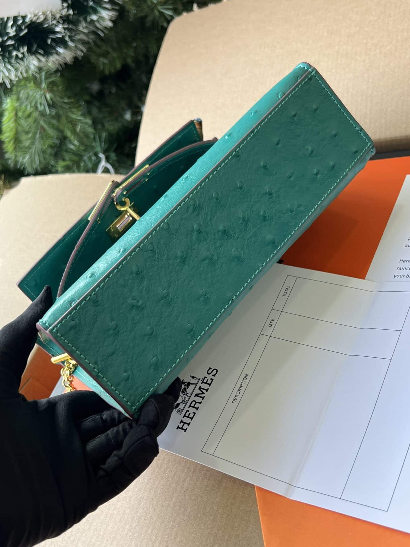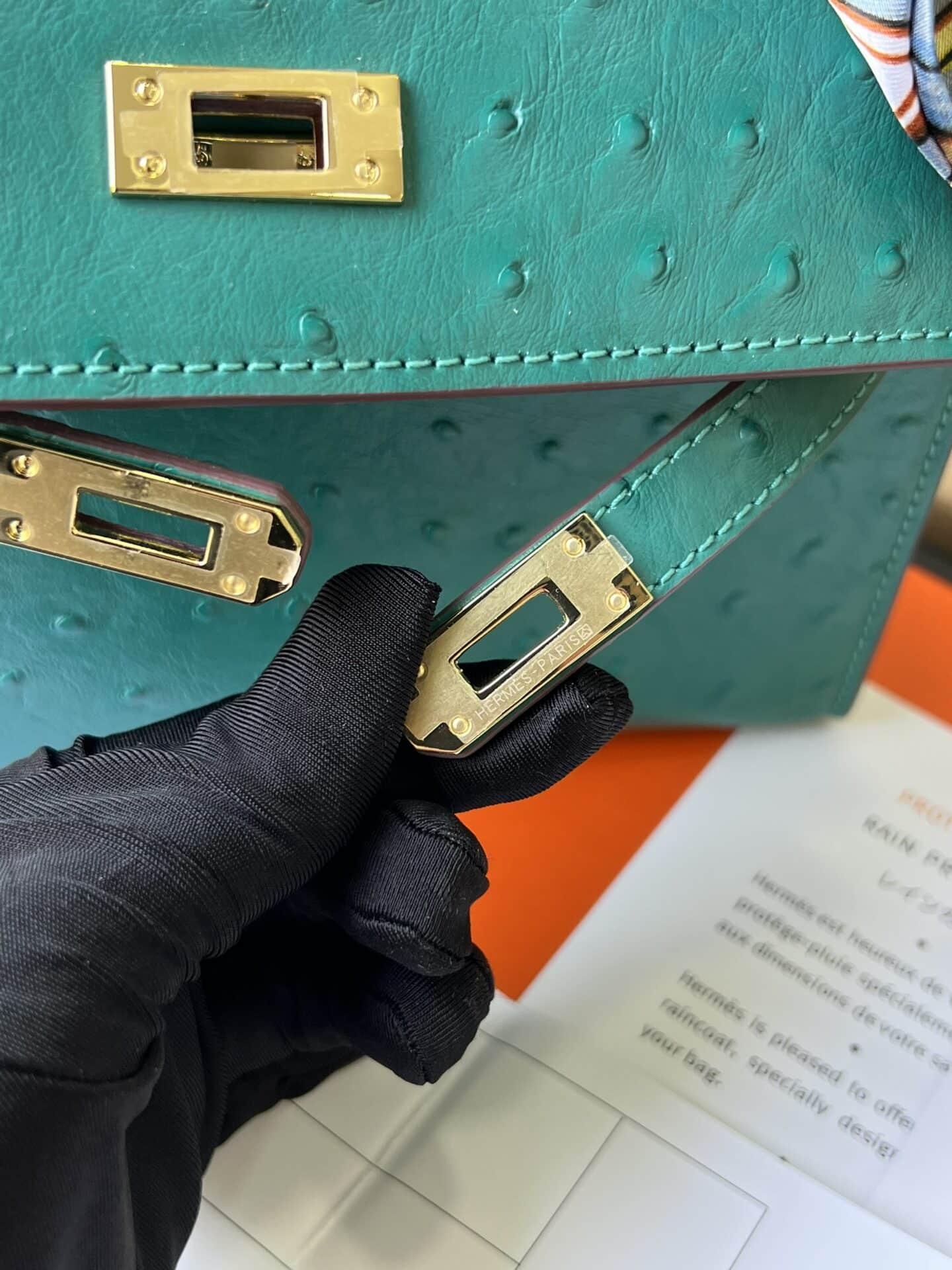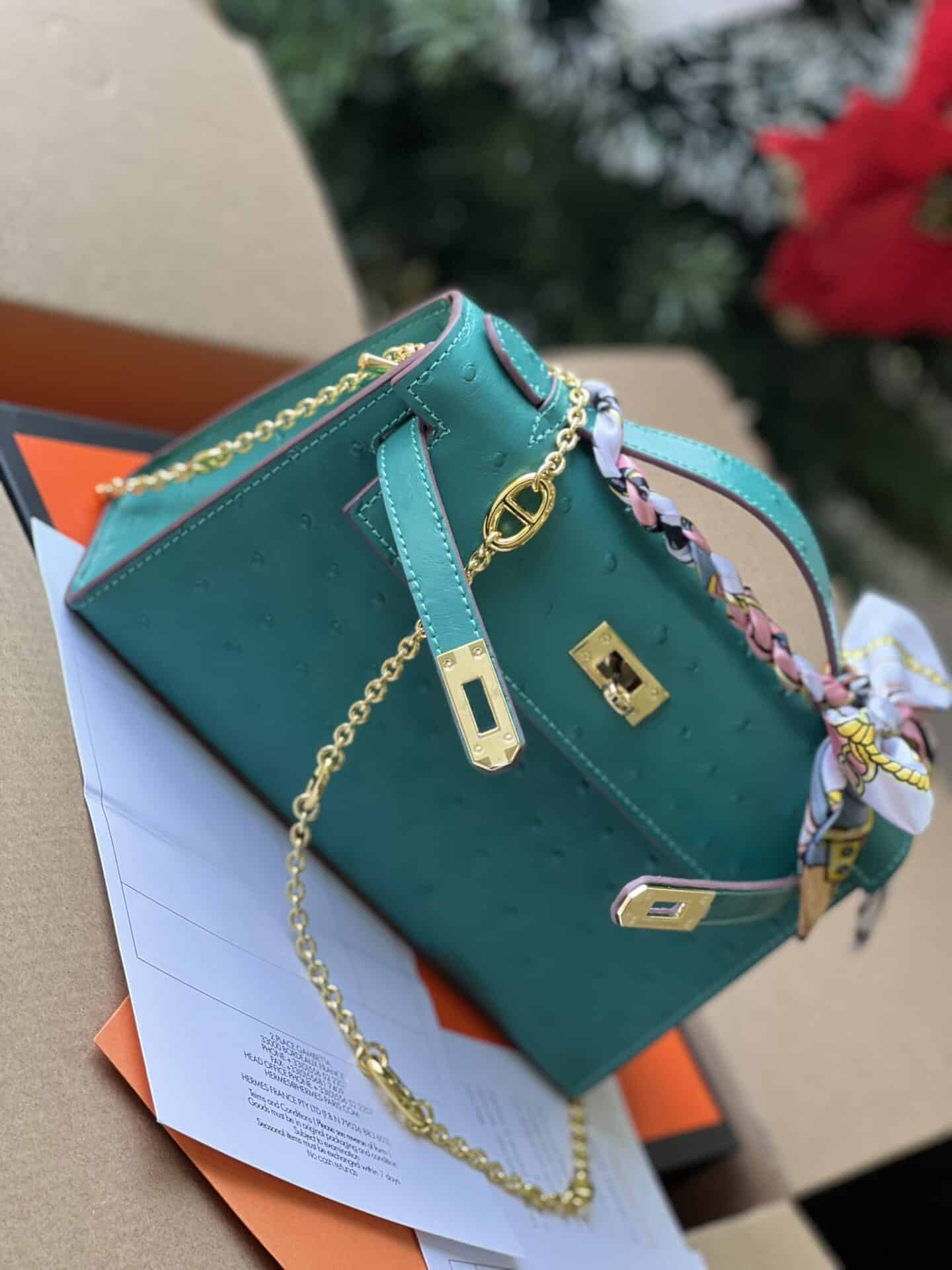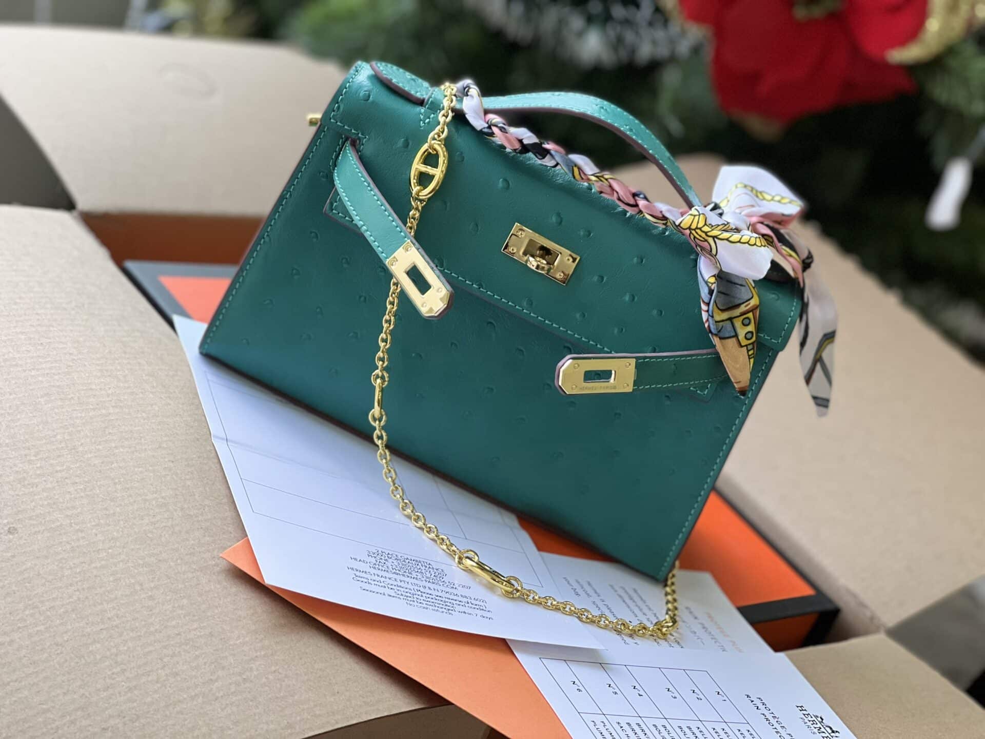 TÚI XÁCH HM KELLY POCHETTE VÂN DA ĐÀ ĐIỂU CAO CẤP TAG VÀNG MÀU XANH LÁ