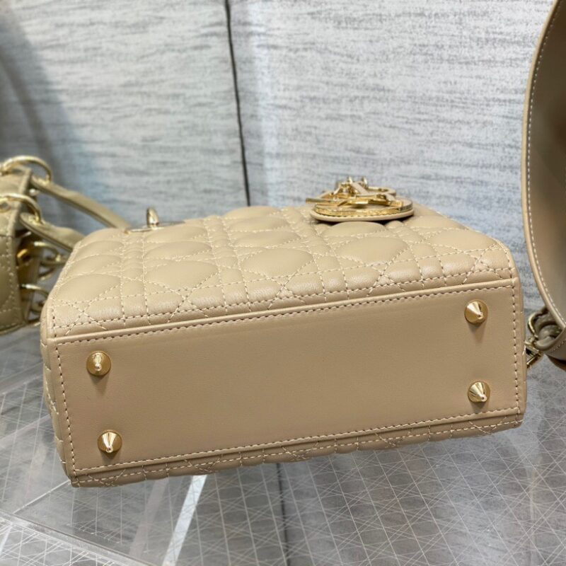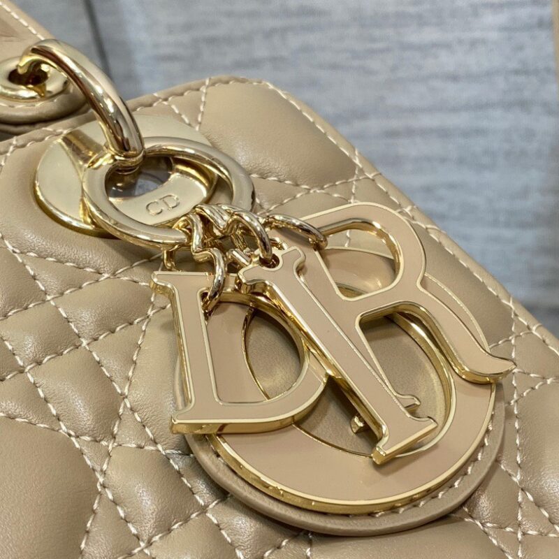 Túi được chế tác từ chất da thật mềm mại và mịn màng, sang trọng. Những đường may tinh tế tạo thành hình thoi nổi bật trên nền chất liệu da mềm mại khiến mẫu túi được yêu thích hơn hẳn trong suốt nhiều năm nay. Túi Lady Dior được trang trí bằng các chi tiết kim loại cao cấp sáng bóng. Các chữ “D, I, O, R” bằng kim loại treo bên góc túi được lấy cảm hứng từ sự yêu thích của Christian Dior với những tấm bùa hộ mệnh.