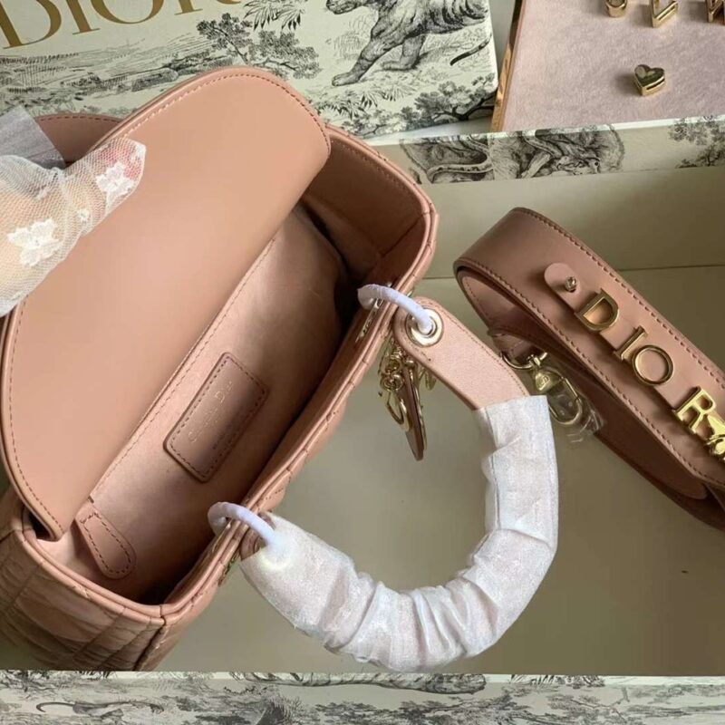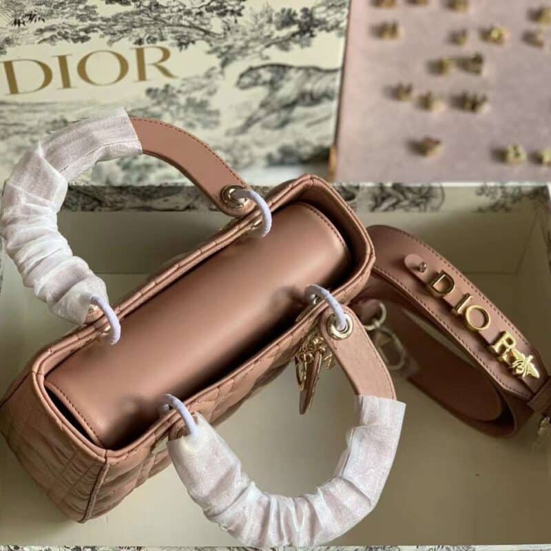 Quai xách đính rời thân túi bằng móc kim loại đặc trung. Túi đeo chéo đi kèm có chất liệu bằng da cứng với thiết kế to bản, trên quai gắn tên thường hiệu với các chữ cái D, I, O, R được mạ vàng và điêu khắc sắc nét sang trong.