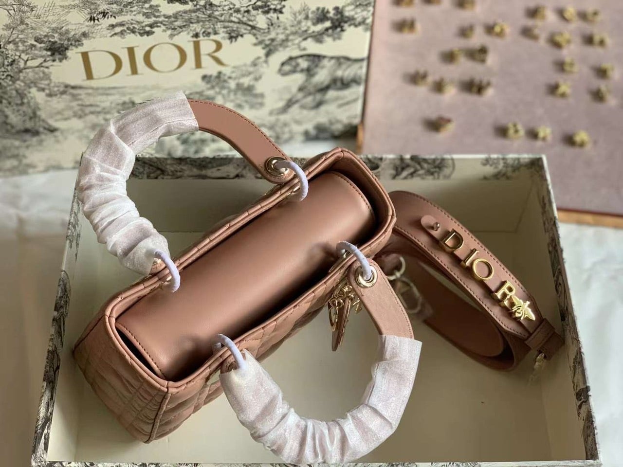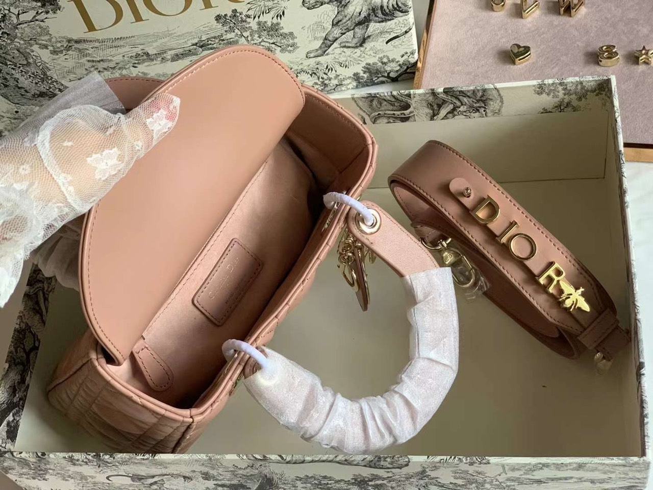 Quai xách đính rời thân túi bằng móc kim loại đặc trung. Túi đeo chéo đi kèm có chất liệu bằng da cứng với thiết kế to bản, trên quai gắn tên thường hiệu với các chữ cái D, I, O, R được mạ vàng và điêu khắc sắc nét sang trong.