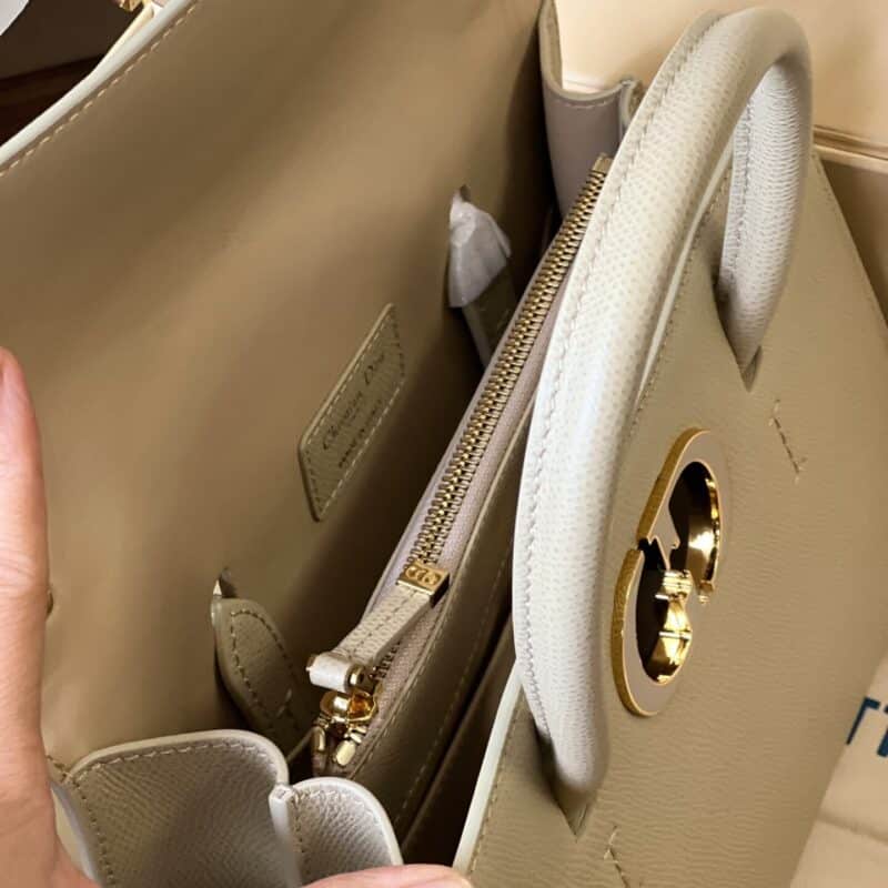Một ổ khóa “CD” (dấu hiệu của dòng 30 Montaigne) được đặt trang trọng ngay giữa, tổ điểm cho phần nắp lật ngược. Nắp túi mở ra để lộ phần bên trong rộng rãi được chia bởi một túi zip lớn. Trong khi đó, dòng chữ 30 Montaigne được dập nổi kín đáo ở mặt sau.